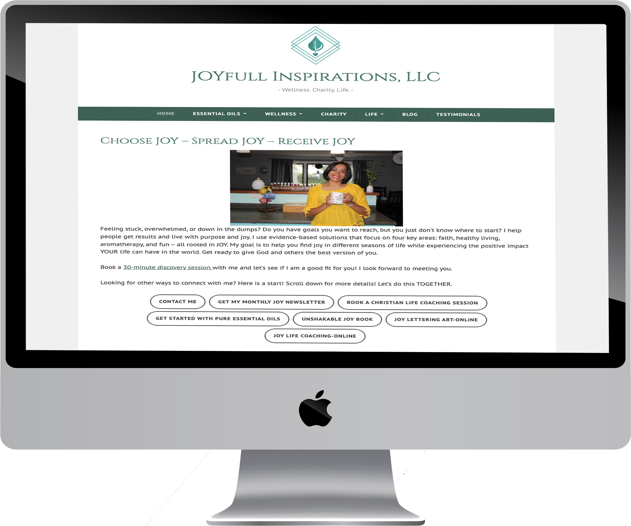 For the Joyfull Inspirations website, a simpler and more stunning layout was requested as well as presenting the information in a more succinct way.  The bottom photo illustrates this simpler appearance by having less buttons and wordiness.   The user would be able to interact with the site in a more meaningful way.  The use of popups and clickable buttons superimposed on a slideshow carousel were incorporated to encourage the user to navigate the current site.  Click on the photos to see the website.