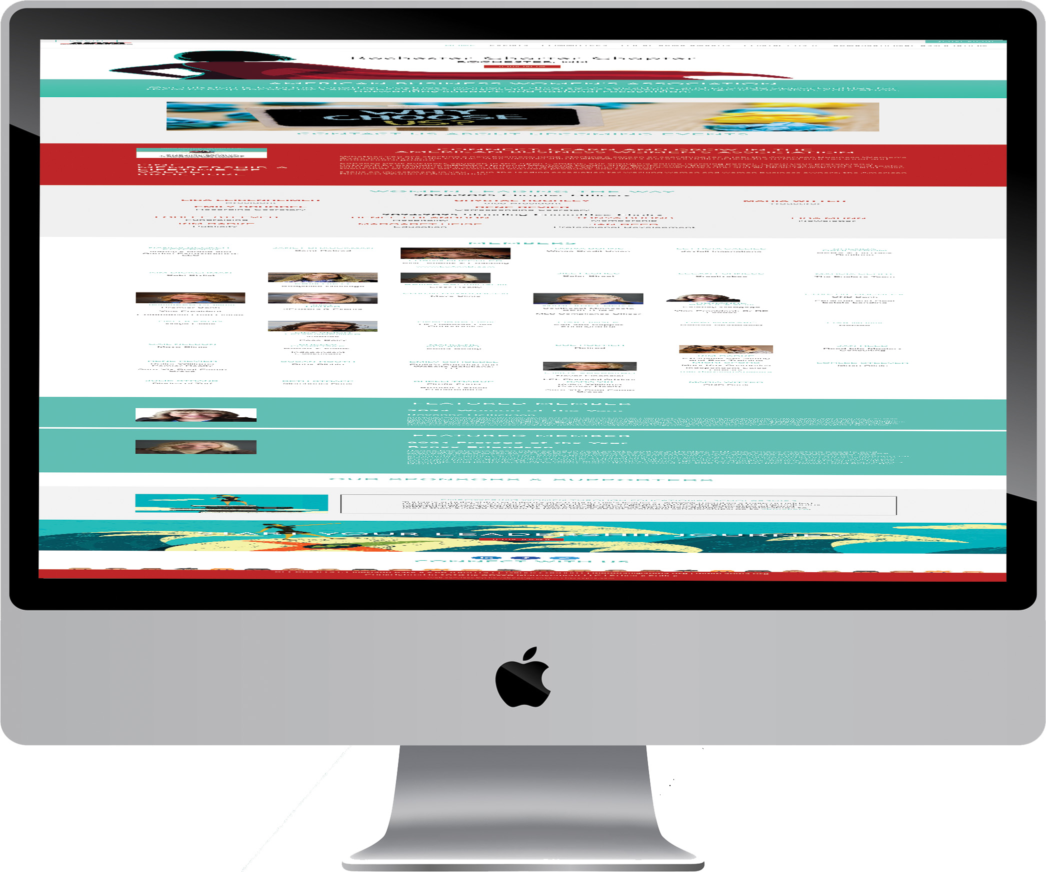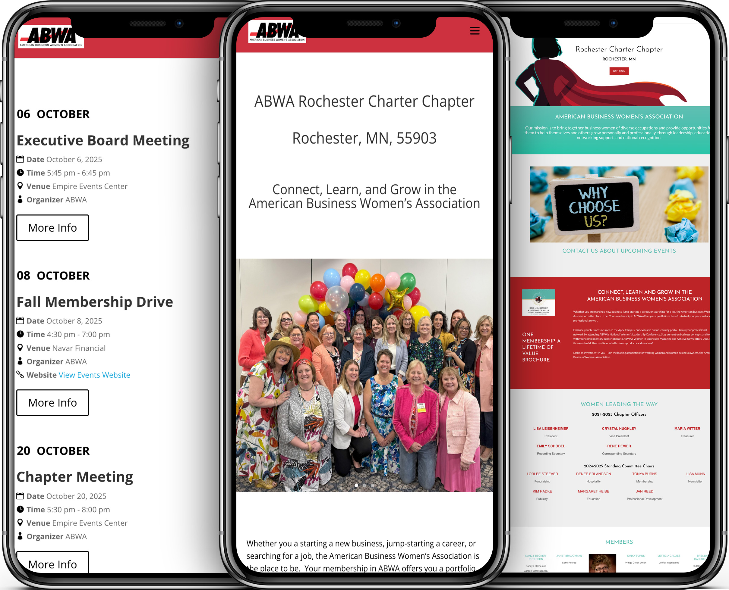 For the Rochester ABWA (American Business Women’s Association) website, less colors were used as to not overwhelm the user.   There was also an emphasis on more content and less photos, as illustrated on the center from the bottom desktop photo.  The mobile views also used less clutter and more content, as illustrated in the left two photos on the mobile view.   A slideshow carousel was incorporated on the current home page to encourage the user to navigate the site.  Click on the photos to see the website.
