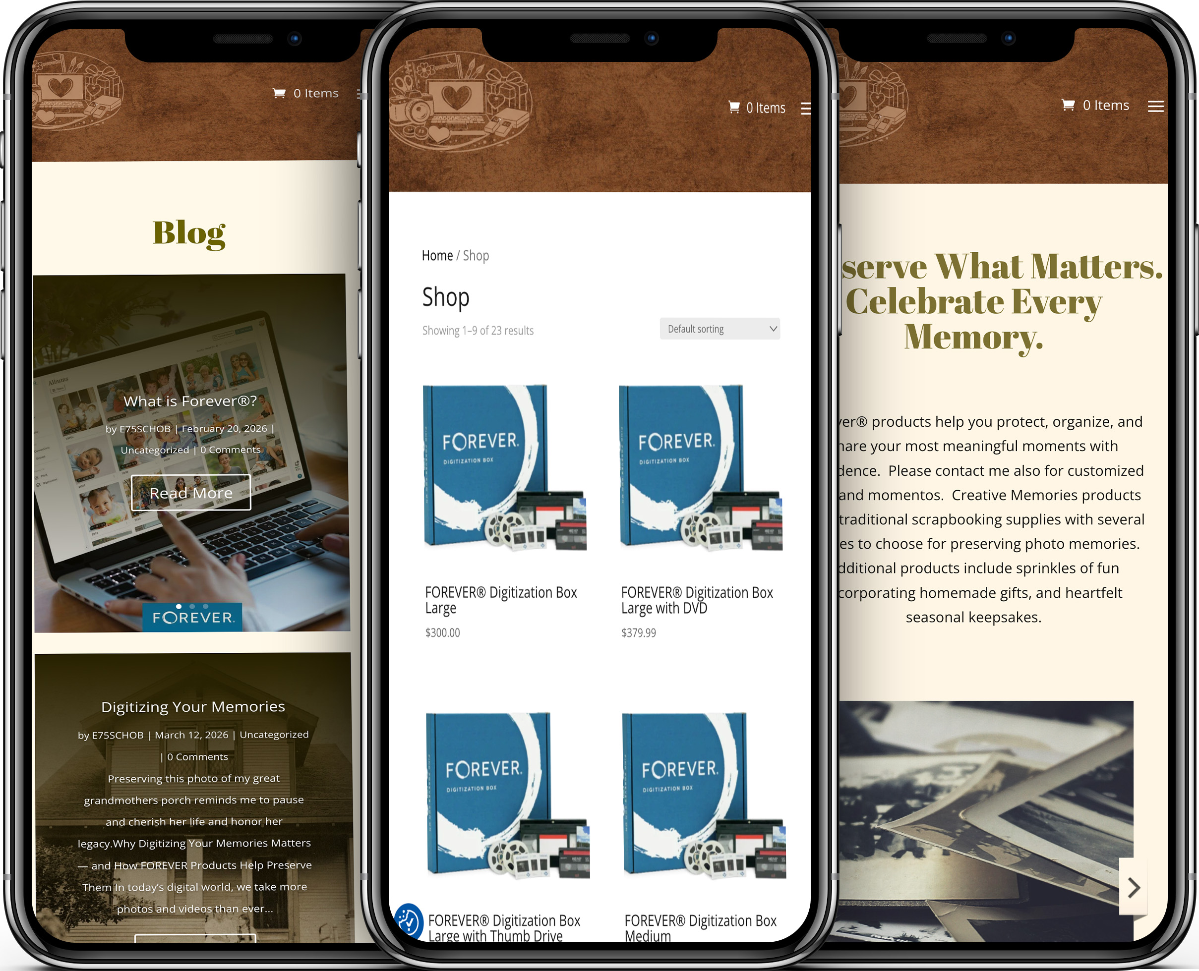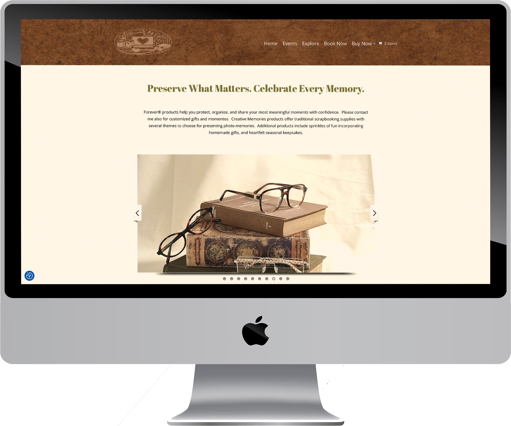 We added a Divi theme to create the ultimate visual appealing site as seen on the right photos. WooCommerce was also integrated with Square, so you can shop for products online if that is what you would like. Click on the picture to link to the website. Plus, you get access to the Creative Memories website as well as the ability to sign up for a Forever account.